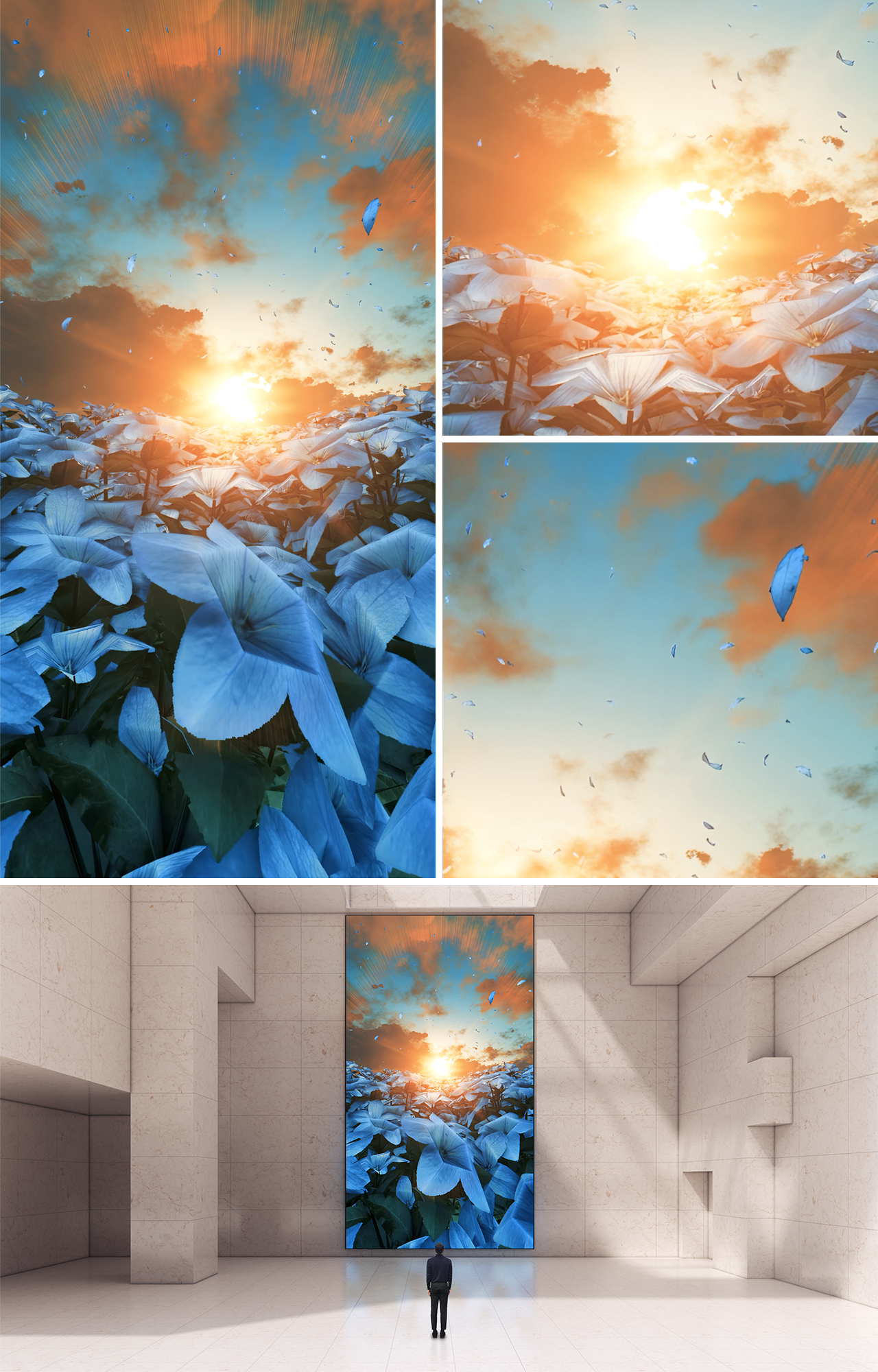 ‘Blue Petals’는 하늘과 땅 사이에서 부유하는 하나의 꿈입니다. 모든 것은 보이지 않는 흐름에 이끌리듯 떠오르고, 빛은 조용한 숨결처럼 움직입니다. 이곳에서는 아무것도 사라지지 않습니다. 모든 것들이 부드럽게 변하며, 미지의 세계로 조용히 옮겨질 뿐입니다.