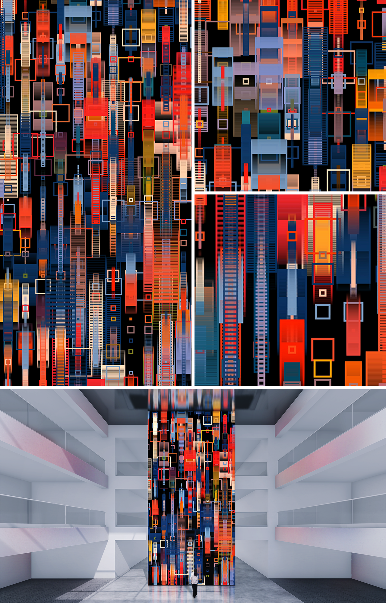 Polychrome Reverberations는 퍼린 노이즈(Perlin noise)에 반응해 수직으로 이동하는 직사각형들의 리듬감 있는 움직임을 시각화한 제너러티브 작품입니다. 형태들이 팽창하거나 수축하며, 화면 위를 흐르는 파도처럼 유기적인 흐름을 만들어냅니다. 서로 다른 간격의 윤관선들이 시각적 효과를 주며, 배경색과 자연스럽게 어우러져 끊임없이 변화하는 그라데이션을 만들어냅니다. 강렬한 색상들이 층층이 겹치고 서로 반응하며, 화면 전체에 밀도 있고 역동적인 색채의 흐름을 만들어 냅니다. 기하학적 형태들이 일렁이고 겹쳐지며 새로운 색과 형태의 조화가 만들어지며 또 다른 시각적 리듬을 만들어냅니다. 이 작품은 색, 형태, 알고리즘이 만들어내는 끊임없이 변화하는 시각적 안무를 통해, 관람자에게 계속해서 새롭게 펼쳐지는 시각적 음악을 경험하게 합니다.