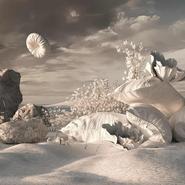 이 작품은 일상적인 오브제를 통해 초현실적인 미학을 탐구하는 작품이다. 부드럽고 유연한 물체들이 사막의 황량한 풍경 속에 놓여져 있으며, 이는 자연의 경이로움과 인공물의 조화로운 공존을 상징한다. 작품은 일상에서 쉽게 접할 수 있는 오브제를 통해 편안함과 휴식을 상징하면서도, 이를 비현실적인 공간에 배치함으로써 관람자에게 새로운 시각적 충격과 사색의 기회를 제공한다. 하늘을 나는 듯한 물체와 기묘한 형태는 초현실주의적인 요소를 더하며, 현실과 환상의 경계를 흐릿하게 만든다. 이 물체들의 부드러운 곡선과 텍스처는 자연 속 바위와 식물과 대조를 이루며, 이질적인 요소들이 한데 어우러지는 장면을 만들어낸다. 이는 현대 사회에서의 인간과 자연, 일상과 비일상의 관계를 재해석한 작품으로, 보는 이로 하여금 일상의 소소한 물건들이 어떻게 예술로 승화될 수 있는지를 생각하게 한다.