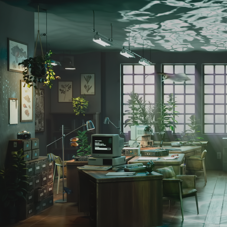 사무실 책상에 앉아 방 안 가득 바닷물이 차오르는 상상을 한다. 지루한 이곳도 멋진 휴양지가 될 수 있다. 찰랑이는 너울과 산란하는 햇빛을 가르며 나아간다. 책상과 모니터 사이를 헤엄치는 경험은 기분 좋은 낯섦이다. 창가의 화분과 미처 닫지 못한 서랍의 틈이 물고기들에게 좋은 보금자리가 되었다. 다채로운 해양 생물 들은 일상 공간을 유영하며 이곳저곳에 생명을 불어넣는다. 물결에 식물들이 하늘거리고, 작은 물고기들도 이곳이 생소한 듯 물건들에 관심이 많다. 사무실 속 작은 바다가 수면 아래에 모든 것을 포용하고, 투과하는 햇빛은 평온하게 일렁이는 자취를 남긴다. 짧은 휴가와도 같은 사무실에서의 생생한 공상을 담은 작품이다.