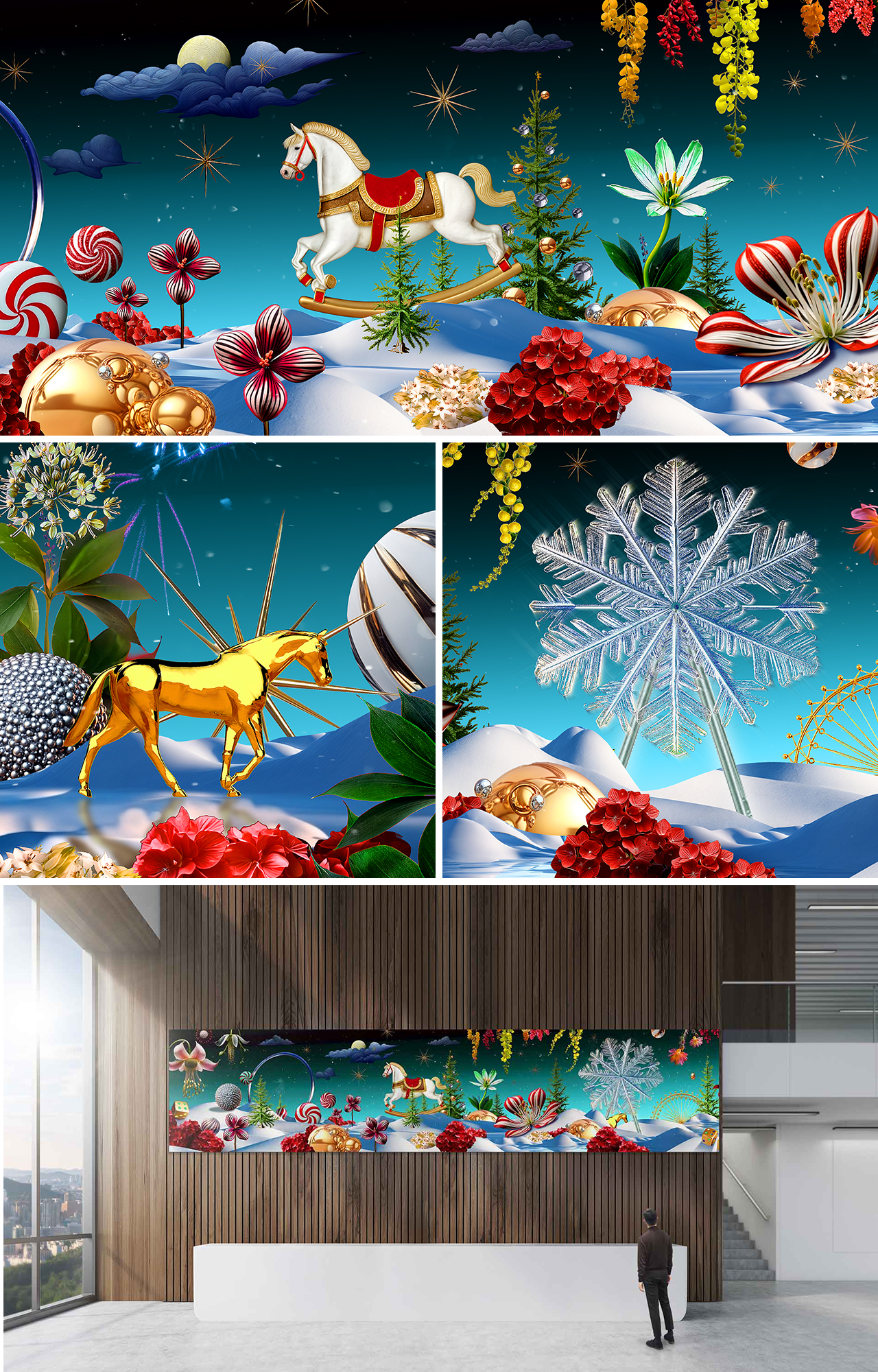 아티스트의 소중한 어린 시절 추억에서 영감을 받은 향수를 불러일으키는 크리스마스 원더랜드로 여행을 떠나보자. 이 매혹적인 디자인은 어린 시절의 마법을 불러일으키는 기발하고 실제보다 더 큰 홀리데이 요소들이 특징이다. 반짝이는 조명 사이에서 장난스럽게 꼬불거리는 대형 장식품과 사탕 지팡이, 하늘에서 춤추는 즐거운 눈송이 등 어린 시절의 순수한 기쁨을 연상시키는 모습을 상상해보자.