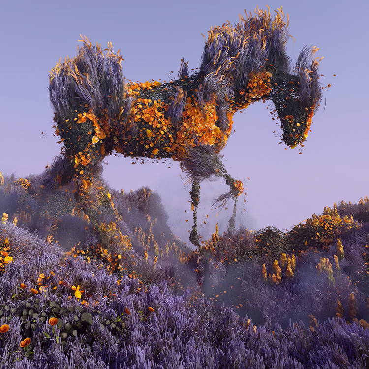 Flower Horse는 자연과 움직임에 대한 탐구인 플라워 시리즈의 일부이다. 각 작품에는 다양한 꽃 덩어리가 동적으로 시뮬레이션되어 유동적인 모양, 사물 또는 동물을 형성하는 것이 특징이다. 꽃말은 말을 활짝 핀 꽃으로 변신시킨 생동감 넘치는 3D 아트웍이다. 후디니의 procedural tools를 사용하여 만든 이 작품은 말의 우아한 형태와 생생하고 유기적인 패턴을 결합한다.