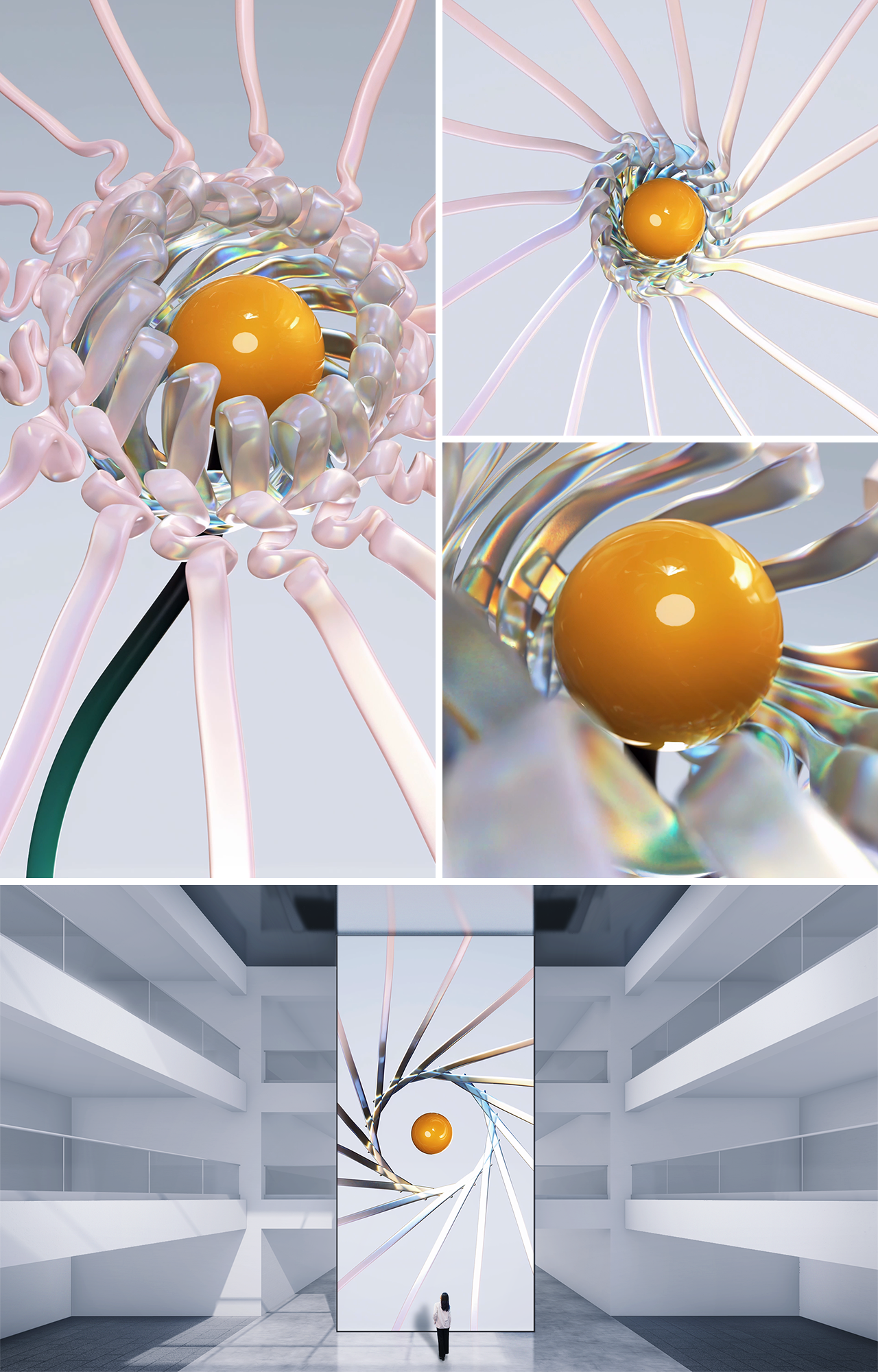 나선이 느린 왈츠처럼 우아하게 회전하며, 유연한 궤적으로 공간 위로 섬세한 곡선을 그려냅니다. 회전하며 형형색색의 빛이 꽃망울이 터지듯 퍼지며, 마치 새벽 첫빛처럼 강렬하게 피어납니다. 나선의 움직임이 끊임없이 이어지며 정교한 패턴을 그려내고, 곡선 하나하나가 마치 교향곡 악보위로 흩뿌려진 음표처럼 찰나의 그림으로 스쳐 지나갑니다. 작품은 점점 고조되는 에너지를 품고 맥동하다가, 마침내 색과 형태가 하나로 어우러지는 찬란한 꽃의 만개로 정점을 이룹니다. 그 찰나의 순간은 눈을 사로잡는 생동감과 끊임없이 변화하는 율동으로 관람자를 깊이 매혹시킵니다.