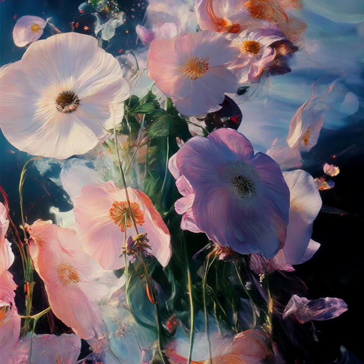 Cloud Flower 은 꽃잎이 대기에 녹아드는 영역에 떠 있다. 부드러운 색조와 부드러운 텍스처는 항상 형성되고 사라지는 생각과 느낌의 일시적인 특성을 반영한다. 개화와 소멸 사이의 몽환적인 공간을 연상시키는 이 작품은 보는 이로 하여금 아름다움의 무상함 속에서 잠시 멈춰 서도록 초대한다. 이 조용한 색과 기억의 소용돌이 속에서 이 작품은 변화, 부드러움, 존재에 대한 부드러운 성찰을 제공한다.