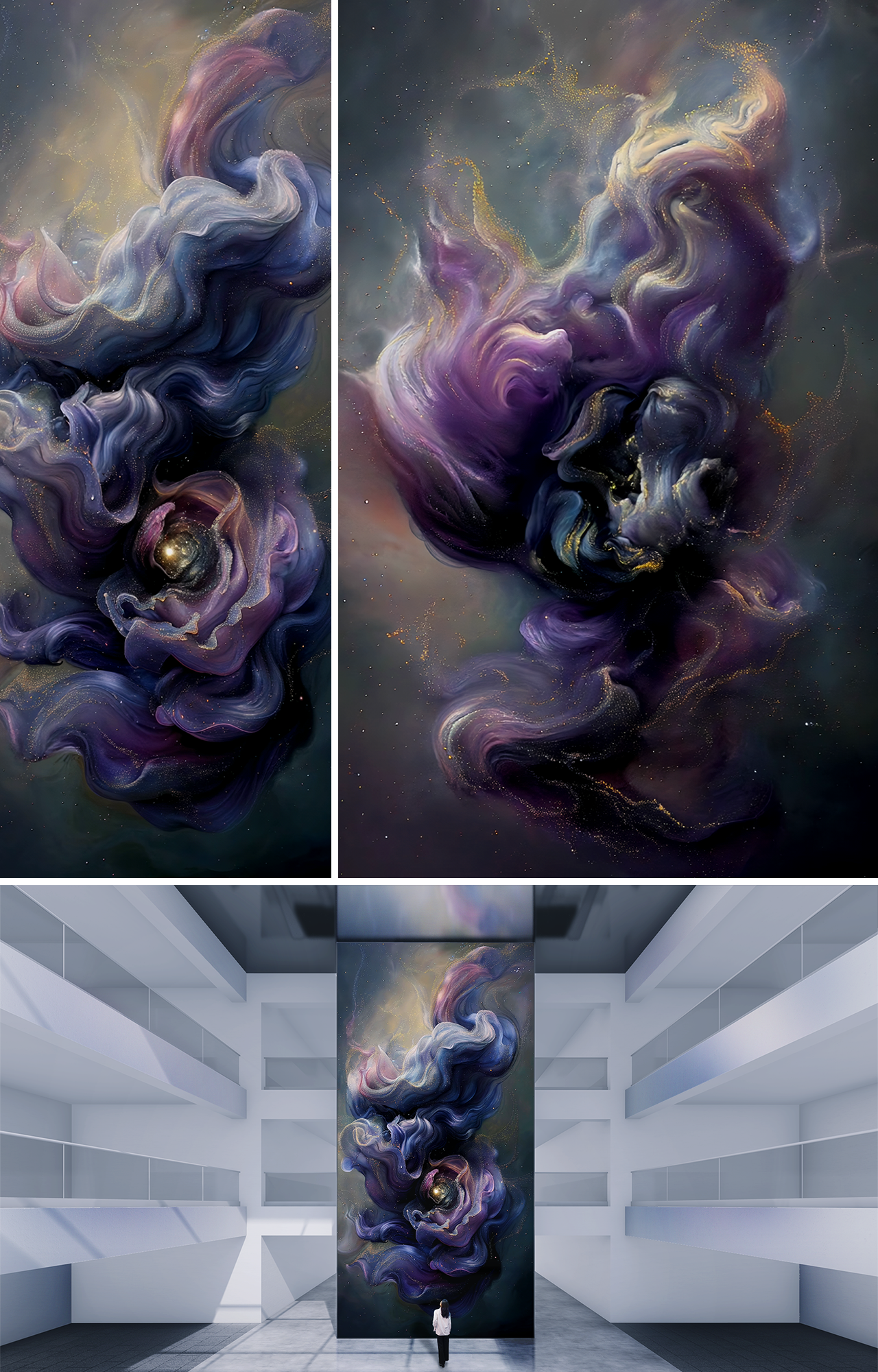 Ethereal Waves는 비단 같은 형태와 별가루 필라멘트의 춤사위로 보는 사람을 끌어들인다. 우아하고 조용한 힘으로 흐르는 실은 마치 움직임 중에 포착된 우주의 꽃처럼 뒤틀리고 피어난다. 이 작품은 부드러움과 강함, 존재감과 항복의 긴장을 담고 있다. 아름다움이 안팎으로 동시에 펼쳐질 때 에너지가 어떻게 움직이는지에 대한 연구이다.