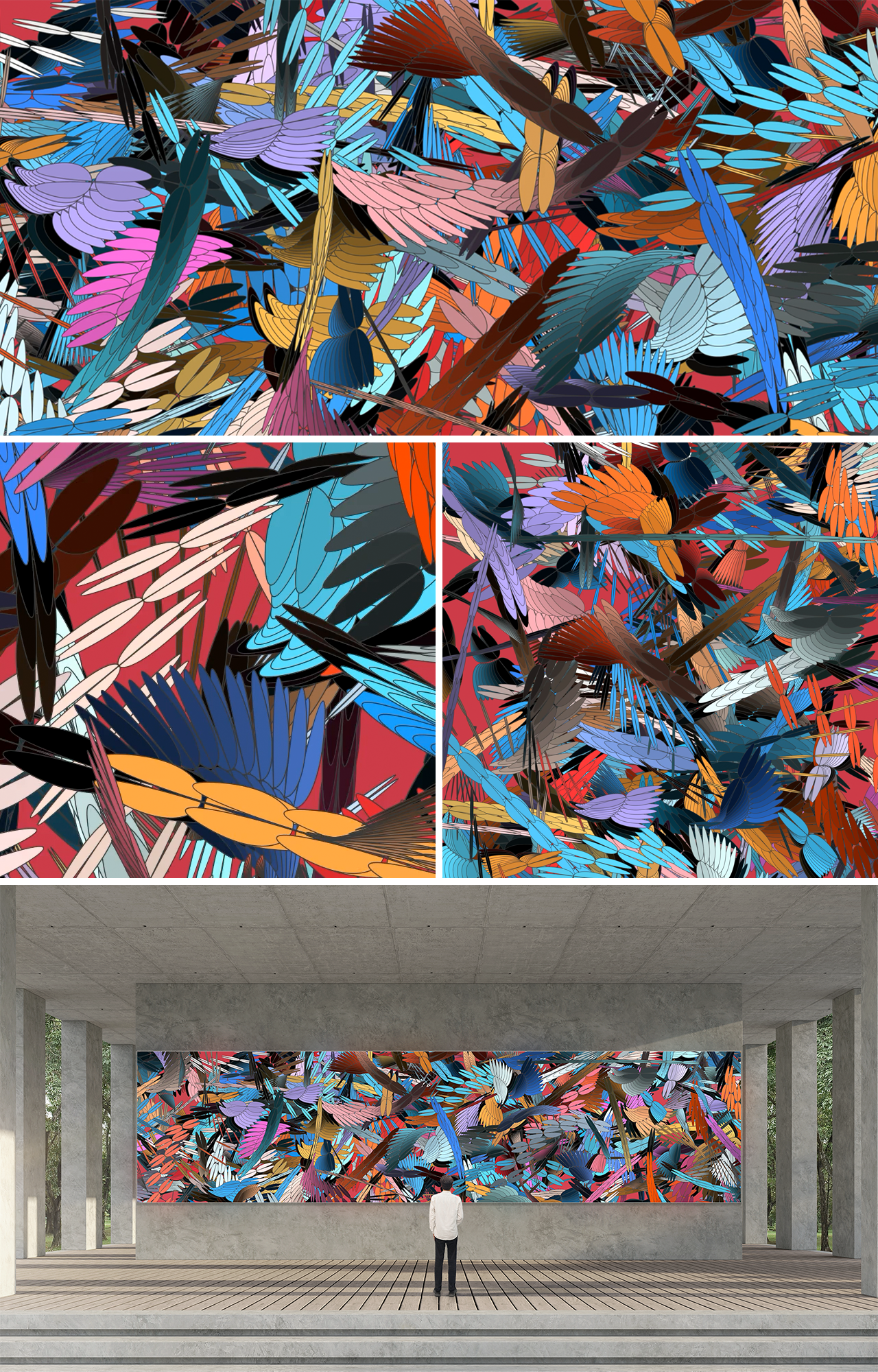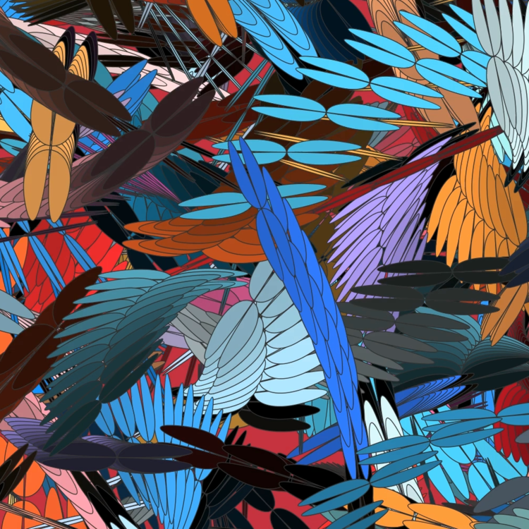 Oscillating Feathers는 깃털의 섬세한 구조를 연상시키는 타원형 형태들로 구성된 제너러티브 작품입니다. 퍼린 노이즈(Perlin noise)에 따라 각 형태는 크기와 간격이 미묘하게 변하며, 날갯짓 중인 날개처럼 생동감 있는 움직임의 환영을 만들어냅니다. 겹쳐진 패턴들은 하늘을 나는 새 떼처럼 보이며, 조밀하게 배열되어 있으면서도 리듬감 있게 살아 움직이는 듯한 생동감을 자아냅니다. 이 깃털 같은 요소들이 화면을 가로질러 퍼져나가며, 맥동하는 움직임과 강렬한 색채로 구성된 시각적 안무를 만들어냅니다. 이 작품은 알고리즘으로 생성된 형태를 통해 새의 날개에서 느껴지는 우아함과 복잡성, 그리고 집단적 에너지의 순간을 포착합니다.