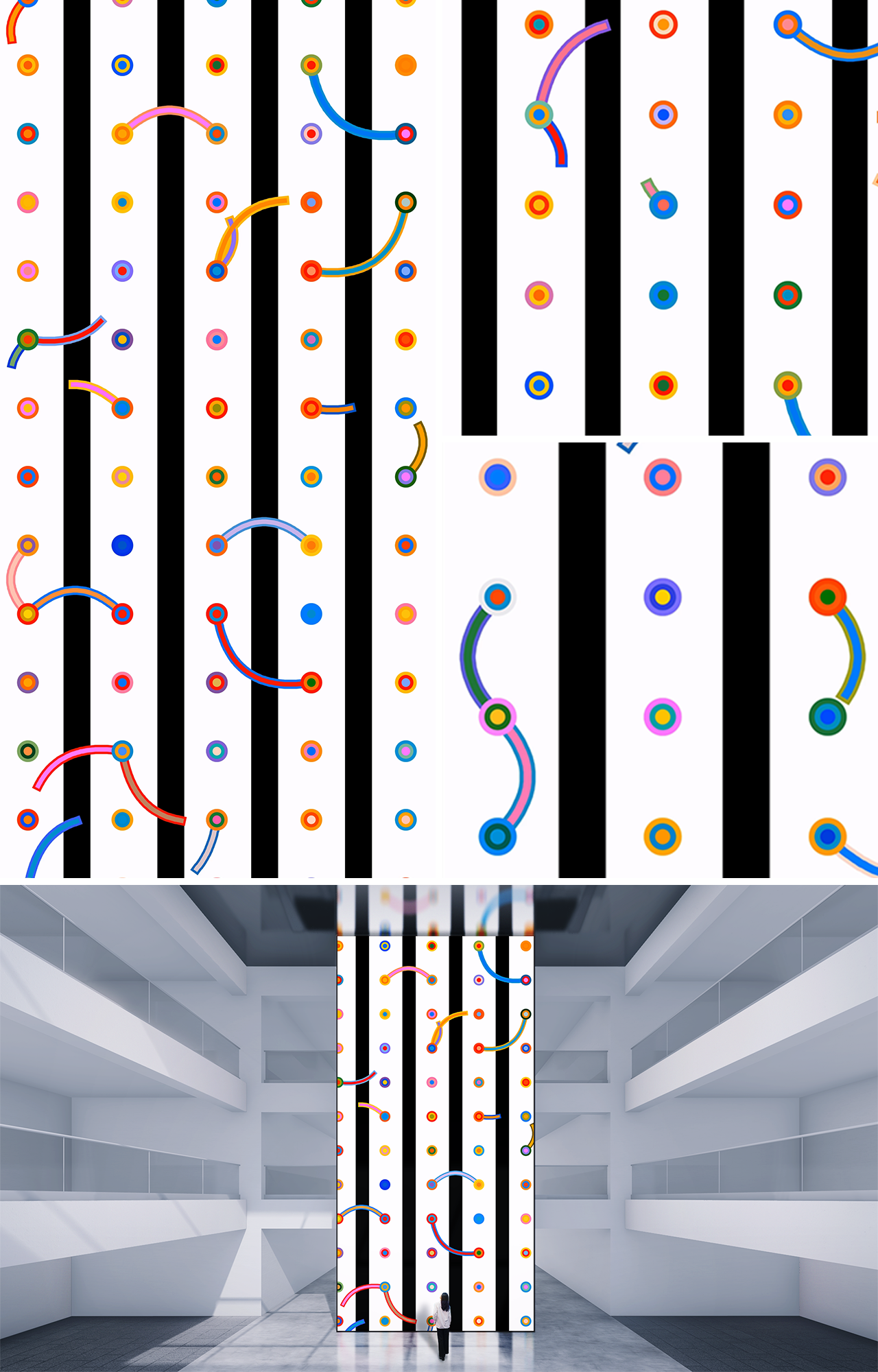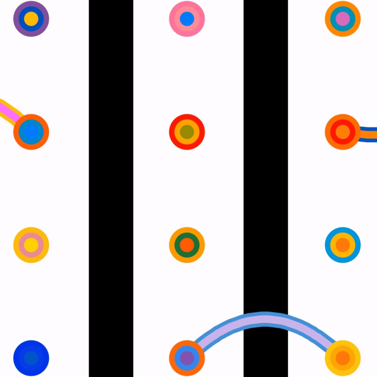 Threading Dots는 검은 배경 위에 배치된 수직 흰색 기둥들이 화면 전체에 리드미컬한 구조를 만드는 제너러티브 작품입니다. 각 기둥에는 다채로운 컬러의 동심원이 일정한 간격으로 배열되어 있어 마치 그리드 위에 놓인 표식처럼 보여집니다. 이 동심원들은 정적인 상태로 남아 있지만, 일부 점은 다른 점과 연결되며 곡선의 경로를 형성합니다. 점들이 연결되며 만들어지는 선들이 공간을 가로지르는 색색의 호(arc)가 되어 예상치 못했던 관계를 만들어냅니다. 각 점은 마치 무작위로 짝을 찾아가는 듯하지만 동시에 질서 정연한 배치 속에 유희적 긴장감과 변화를 더합니다. 이처럼 구조와 자율성이 어우러지며, 정밀함과 우연, 규칙과 자유가 공존하는 역동적인 시각적 균형이 만들어집니다.