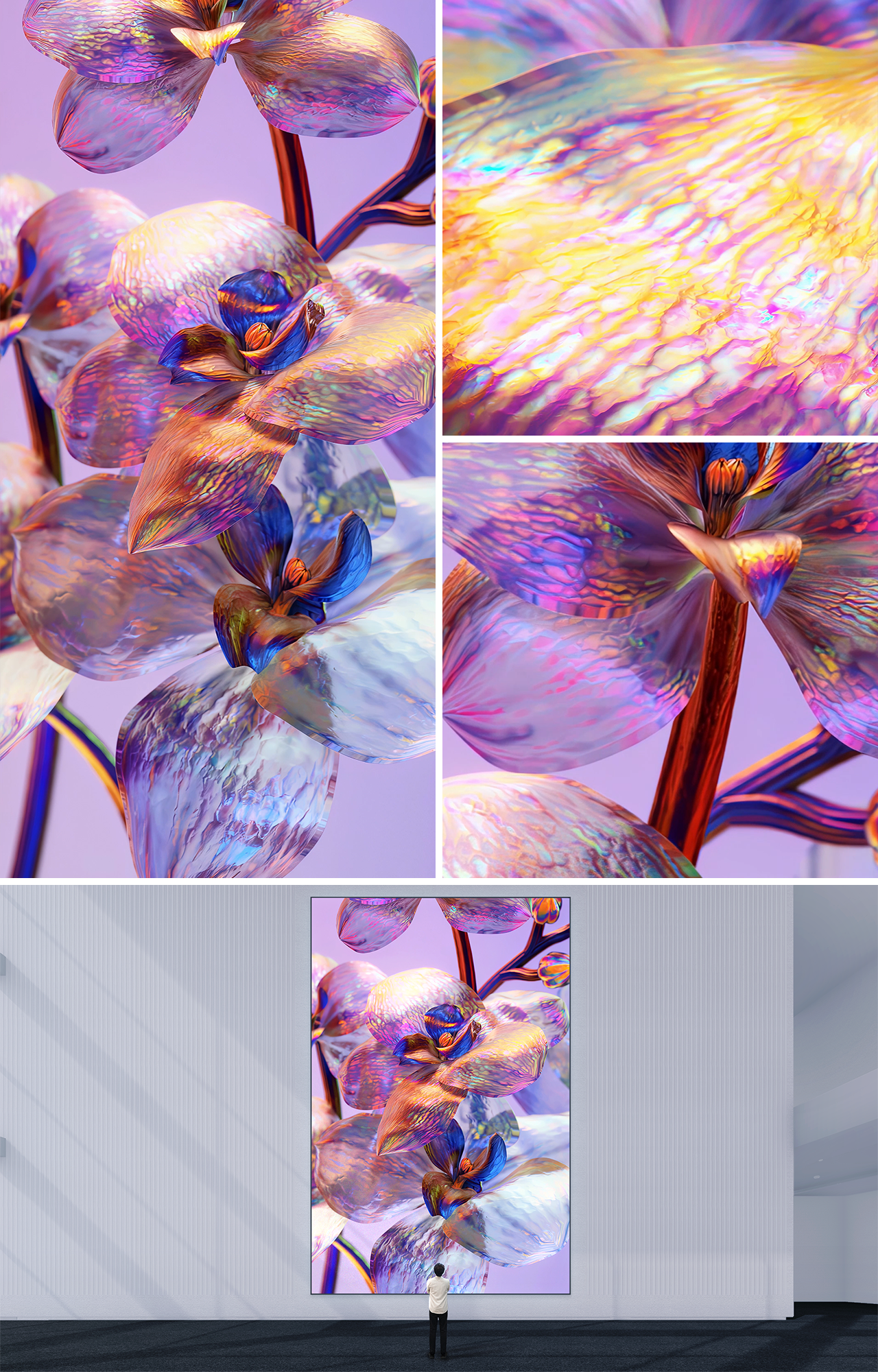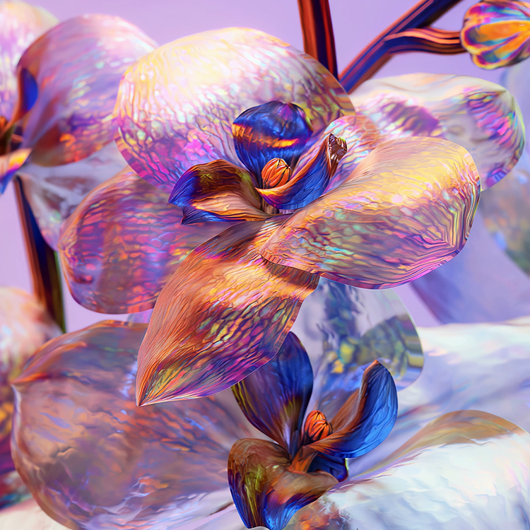 마치 다른 세상에 존재하는 듯한 꽃들이 초현실적인 빛을 머금고 피어납니다. 섬세한 꽃의 움직임이 생생한 색의 교향곡을 펼치며, 소용돌이치는 빛깔은 마치 천상의 선율처럼 부드럽게 흘러내립니다. 투명한 꽃잎 위로 무지갯빛 파장이 반짝이고, 각 표면은 빛을 받아 굴절시키며 우주 정원의 프리즘처럼 눈부신 광채를 발합니다. 이 작품은 색과 빛이 어우러진 테피스트리로, 몽환적인 분위기 속에서 고요하고 신비로운 감성을 불러 일으킵니다.