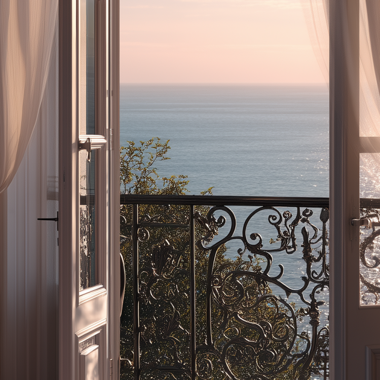 부드러운 노을빛이 하얀 커튼을 적시며 열린 창을 지나 실내를 물들인다. 섬세한 아이언 발코니 너머로 잔잔한 바다가 펼쳐지고, 따뜻한 목재 바닥 위에는 빛과 그림자의 리듬이 여운처럼 깔린다. 낮과 밤 사이의 숨 고르기 속에서 공간은 온기를 품은 고요를 응축하고, 수평선에 걸린 마지막 빛결이 하루의 끝을 조용히 기록한다.