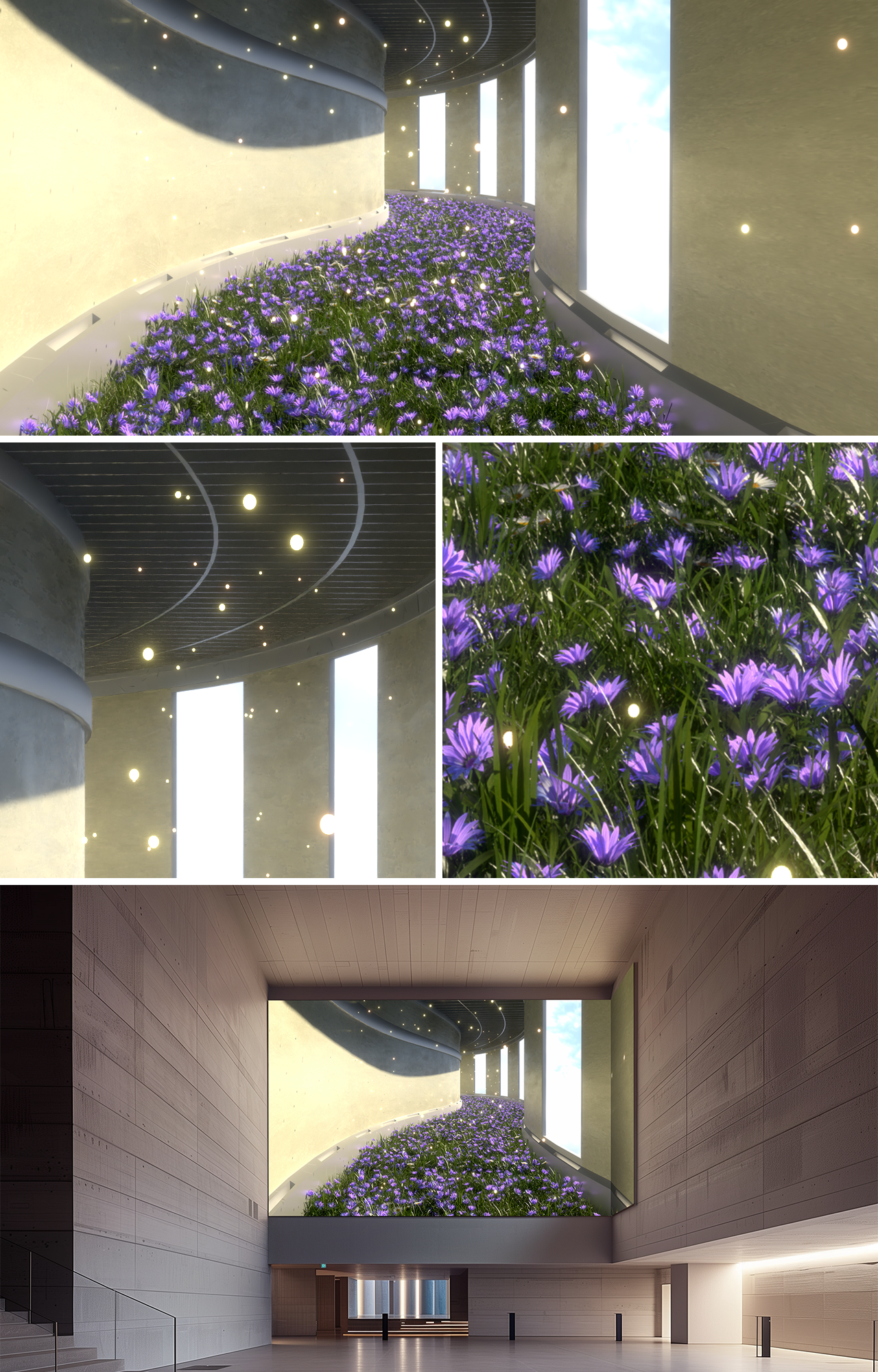 굽이치는 복도가 멀리까지 이어지며, 바닥에서 천장까지 닿는 창들은 공간 가득 빛을 쏟아낸다. 은은한 황갈색 벽과 차가운 금속 장식이 대비를 이루는 가운데, 바닥은 생명력으로 가득 차 있다. 짙은 초록빛 잔디 위에 보랏빛 꽃과 하얀 데이지가 만개하고, 부드럽게 빛나는 구체들이 식물들 사이에서 피어올라 천장 위로 사라진다. 이 초현실적인 복도는 낯설면서도 매혹적인 세계로 초대하며, 현실을 벗어나 꿈꾸는 듯한 여정을 떠나도록 이끈다.