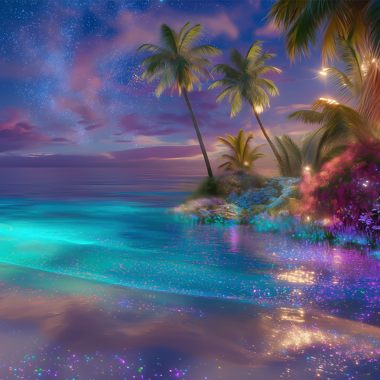 밤의 마법 같은 해변, 생물발광하는 청록빛 바다, 꿈결 같은 색의 꽃들, 그리고 아름다운 별빛 하늘. 별가루 같은 빛으로 반짝이는 잔잔한 파도가 해안을 보라색, 아쿠아, 금빛으로 물들인다. 달빛 아래 꽃들은 은은히 빛나고, 야자수들은 이 마법 같은 세계의 수호자처럼 흔들린다. 이곳에서 우주는 바다와 조화를 이루며 영혼을 경이로움과 평온의 꿈속으로 초대한다.