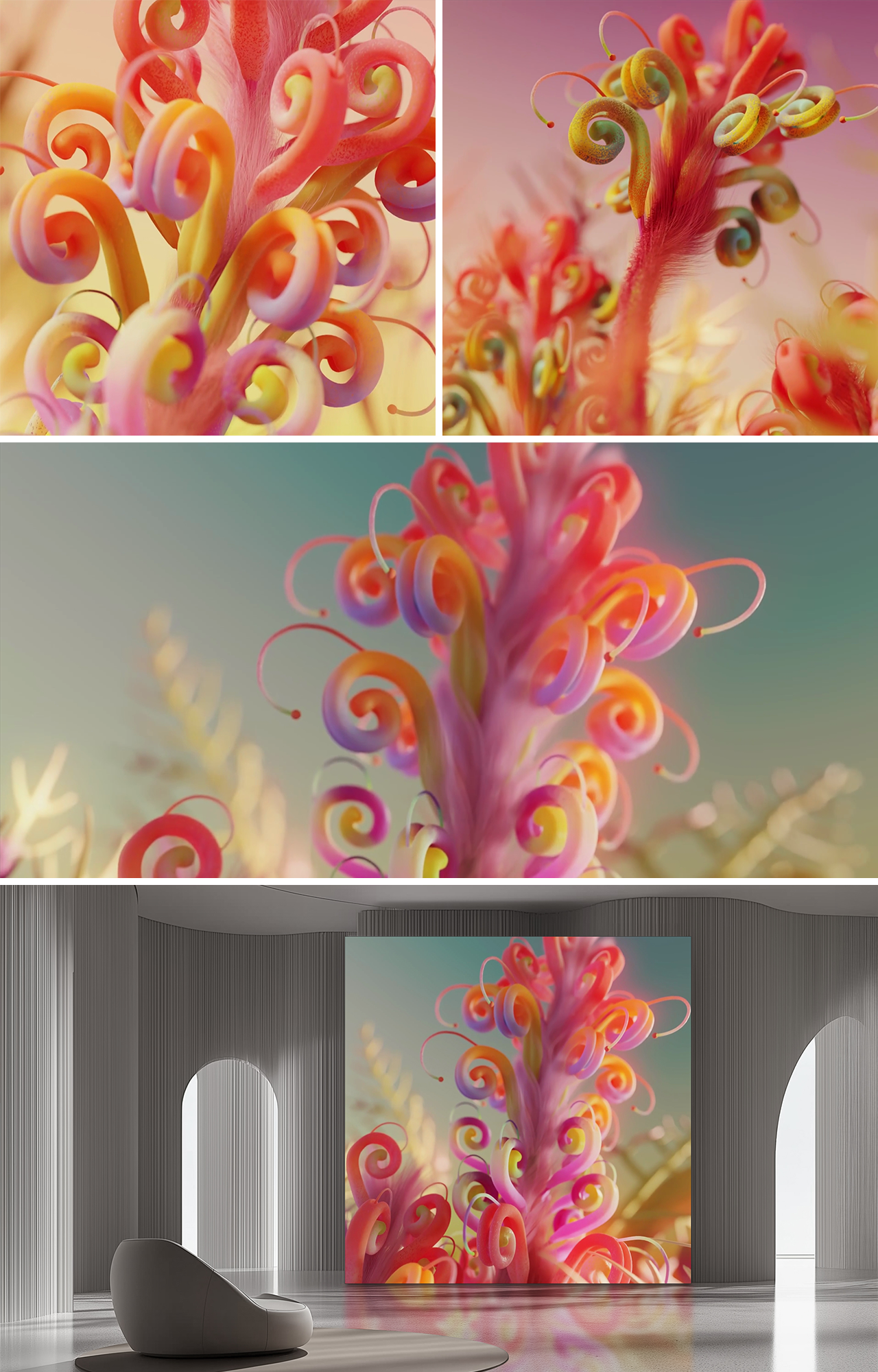 Inflorescence는 그리빌레아(Grevillea)꽃의 아름다움에서 영감을 받아, 낯익으면서도 이질적인 거대한 꽃들의 세계로 이끈다. 과장된 색채와 질감은 현실과 비현실의 경계를 흐리며, 마치 자연의 정교한 형태들이 꿈결처럼 과장된 렌즈를 통해 펼쳐지는 원더랜드에 들어선 듯한 초현실적인 분위기를 자아낸다. 이 작품은 고요한 사색의 순간을 선사하며, 현실과 상상이 부드럽게 맞닿는 세계로 관람자를 초대한다.