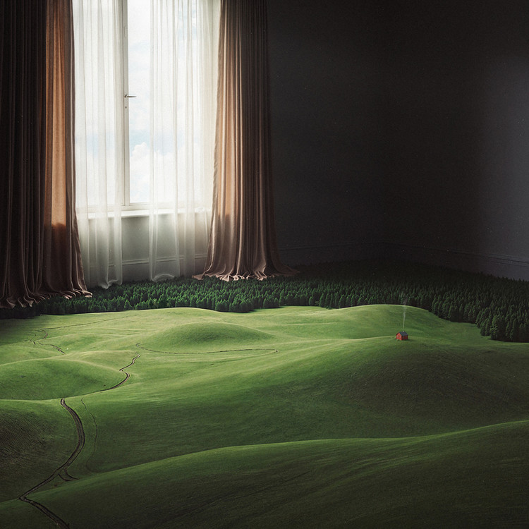 ‘Roomscapes’ 시리즈의 일곱 번째 작품에서, 끝없이 이어지는 초록 언덕이 방 안의 바닥 위로 펼쳐진다. 잔잔한 바람이 풀잎 사이를 스치며 커튼을 흔들고, 외로운 기타 선율을 실어 나른다. 그 소리는 외딴 오두막에서 흘러나오고, 굴뚝에서는 가느다란 연기가 피어오른다. 광활하게 포획된 풍경 속, 단 하나의 인간적인 숨결처럼.