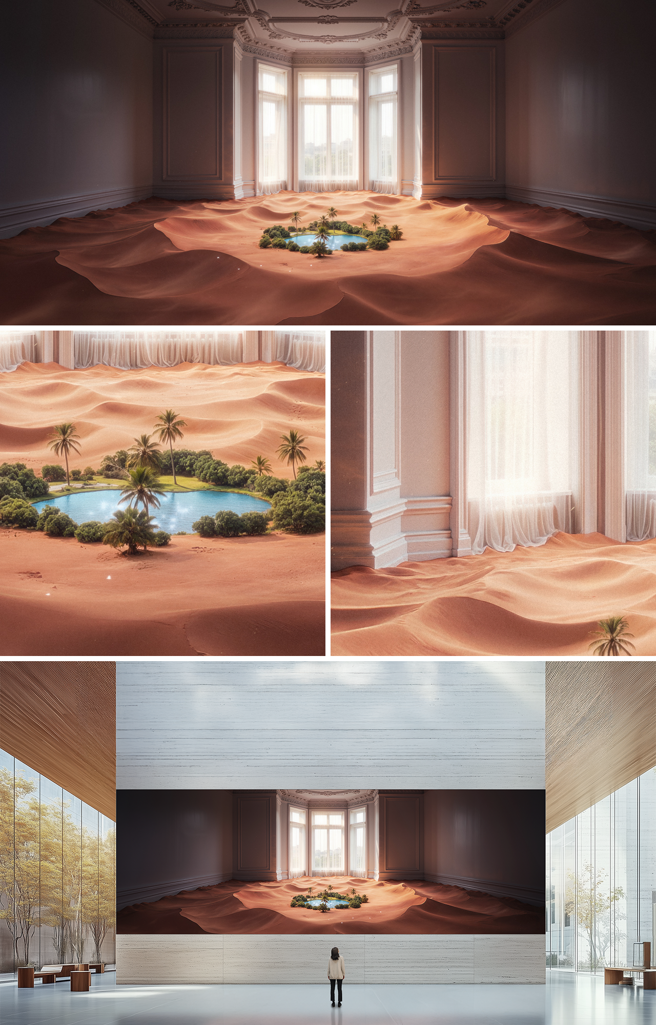 ‘Roomscape 08’은 시리즈의 여덟 번째 작품으로, 고전적인 실내 공간 안에 끝없는 사막을 품고 있다. 바람이 모래를 움직이지만, 이 방의 진정한 목적에는 닿지 못한다 — 그 안의 오아시스를 지키는 것. 하얀 새들이 머무는 그 작은 생명의 원은, 우리가 모두 찾아 헤매는 고요한 중심이자, 거친 바깥세상의 숨결이 오직 커튼만을 부드럽게 흔들 수 있는 안전한 안식처이다.