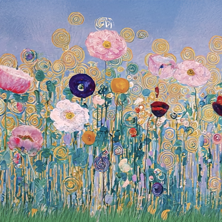 이 작품은 구스타프 클림트의 Mäda Primavesi 에서 착안한 색채와 정서를 바탕으로 한다. 소녀의 드레스와 마음에서 확장된 듯 아름다운 꽃밭으로 재해석한다. 작품은 부드러운 파스텔톤의 색감 위에 피어난 수많은 꽃들을 통해 유년의 순수함과 내면의 생명력을 시각화한다. 한 인물의 초상이 꽃밭으로 확장된 순간, 인간의 감정과 자연의 생명이 서로 닮아 있음을 보여주는 시각적 은유다.