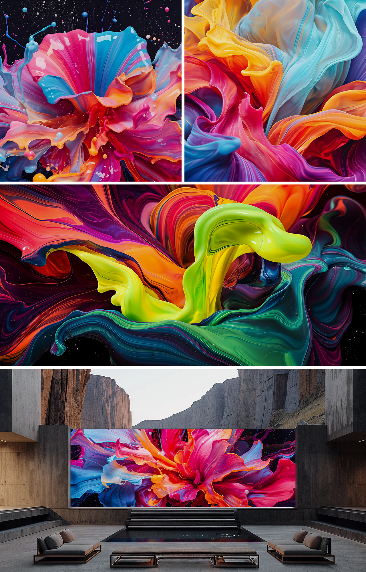 VELVET 시리즈는 리퀴드 잉크 페인팅을 밝고 생동감 넘치는 색채와 구름처럼 흘러가는 잉크의 움직임이 살아 있는 애니메이션 작품으로 변환한다. 사진과 생성적 실험을 통해 색소는 빛나는 증기처럼 부풀고, 소용돌이치며 확장되어 유동적이고 몽환적인 형태로 펼쳐진다. 부드러우면서도 선명한 색조가 어우러져 우주적이면서 회화적인 질감을 만들어낸다. 각 작품은 움직임과 빛, 그리고 공간의 분위기를 채우는 색채에 의해 형성된 살아 숨 쉬는 회화로 완성된다.