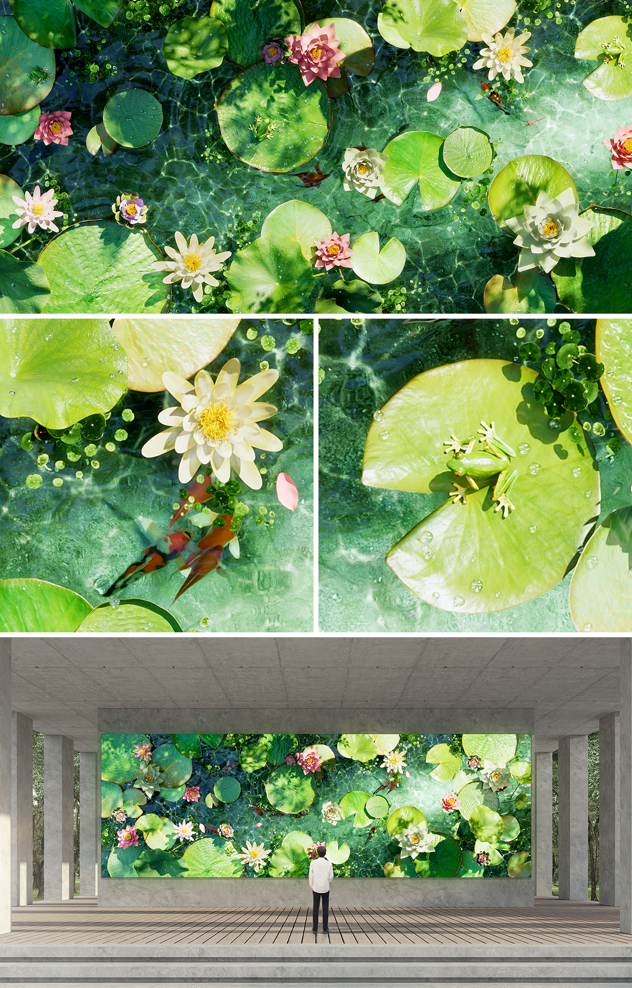 'Pond Ballet'는 수면 위에 부서지는 빛의 결 사이로 다채로운 식생들이 리듬을 이루며, 공간 전체가 하나의 유기적인 생명체처럼 호흡하는 장면을 그려낸 미디어 아트 입니다. 따사로운 여름 햇살이 쏟아지는 연못 위, 투명하게 번지는 물결 위로 연잎이 피어나고 연꽃이 수줍게 봉오리를 터뜨리며 여름의 정점에 다다릅니다. 시선이 수면 아래로 깊게 닿으면 유유히 유영하는 잉어의 움직임과 연잎 사이를 누비는 개구리가 보여지고, 그 위를 자유롭게 가로지르는 잠자리의 비행이 교차합니다. 유려하게 연못 위를 누비는 생물들의 리듬이 찰나의 여름이 지닌 찬란한 생명력을 한 편의 군무처럼 완성됩니다.