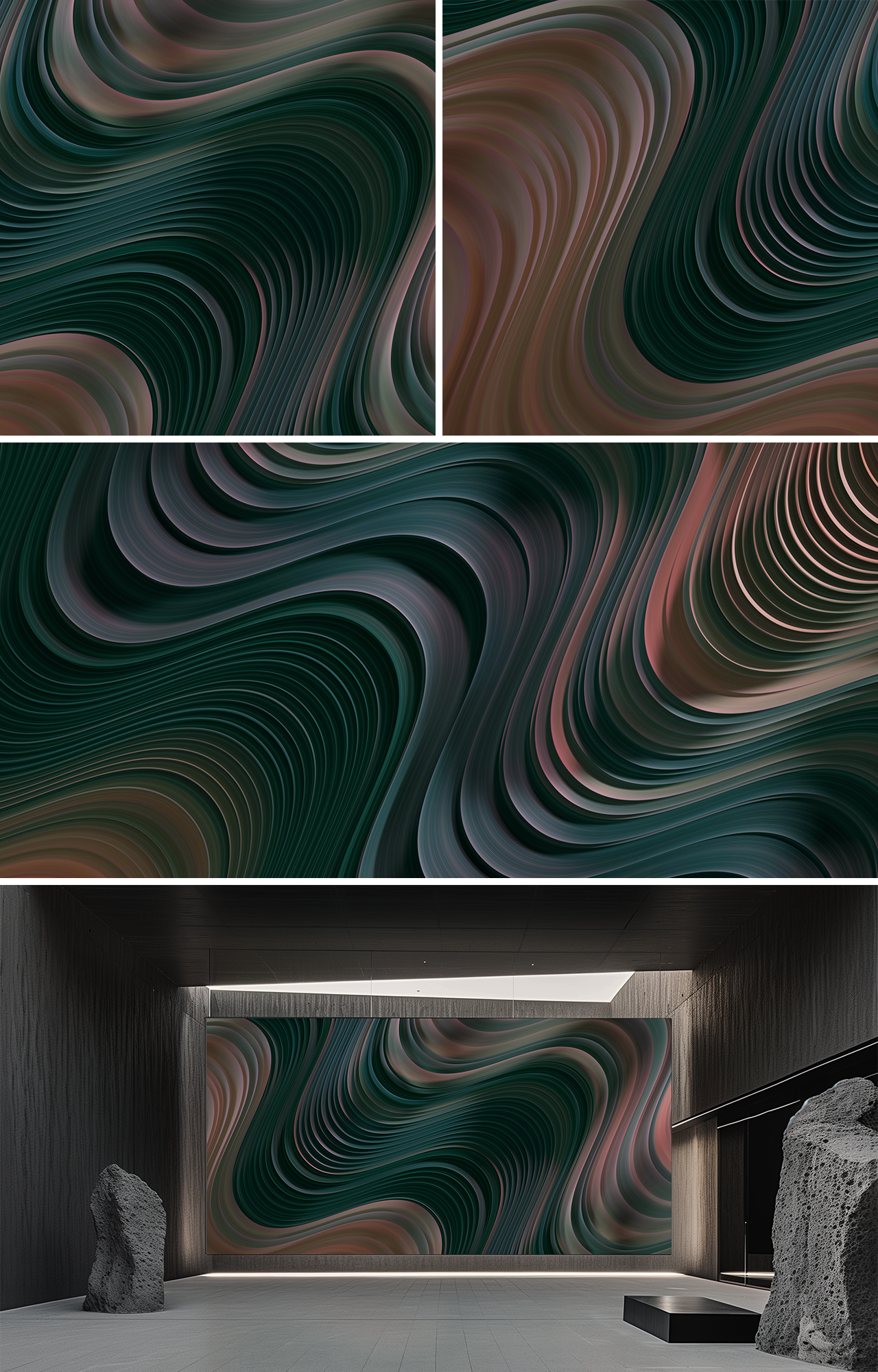 색채의 겹겹한 리본들이 느린 파도처럼 흐르며, 액체 같은 천이 서로를 부드럽게 감싸 안듯 접히고 펼쳐진다. 빛은 이들의 곡면을 따라 미끄러지듯 흘러가며, 움직임이 곧 질감이 되는 고요한 리듬을 드러낸다.